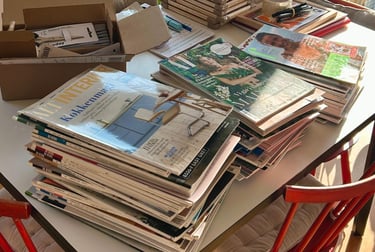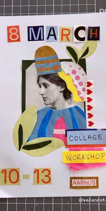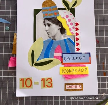 I host a monthly creative workshop at Dokk1, Aarhus, where around 25 people join each session to explore collage in a warm and international atmosphere.